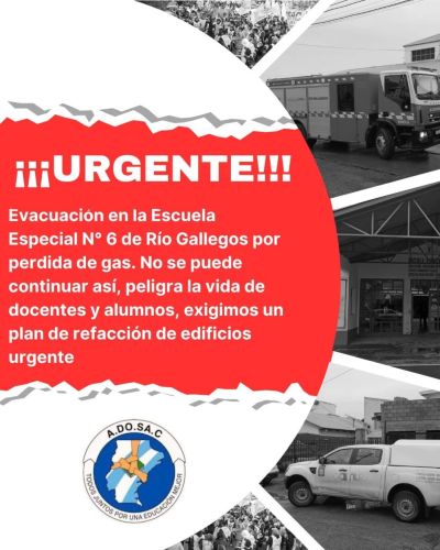 A través de sus redes sociales el gremio difundió mensaje manifestando, “evacuación en la Escuela Especial N°6 de Río Gallegos por pérdida de gas. No sé puede continuar así, peligra la vida de estudiantes y docentes. Exigimos un plan de refacción de edificios urgente y hacemos responsables a las autoridades del CPE y del gobierno por cualquier hecho de mayor gravedad que pudiera ocurrir”.
