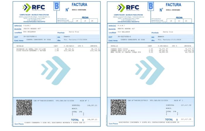 Por factura N° 5483 del 18 de octubre 2024 de la empresa RFC, ubicada en Alberdi 573 de Río Gallegos, a nombre de PAMI – Perito Moreno 467 de esta capital, se adquirió una cámara Tapo C320S por $ 76.075,97; dos cámaras TAPO C310 IP WFI $ 68.320,81 cada una, por $ 136.641,62 y tres Micro SD Canvas 128 GB Kin a $ 14.900,00 cada una y $ 44.700,00 las tres tarjetas haciendo un total de lo facturado de $ 257.417,59.