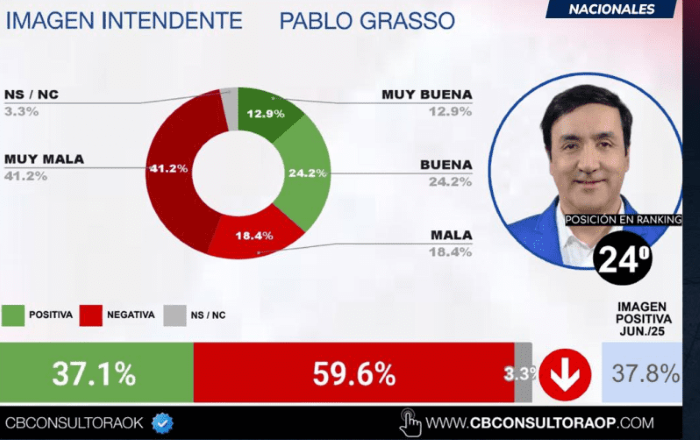Esta caída no es nueva ni repentina. Desde principios de año, Grasso viene en picada. En febrero conservaba alrededor de un 49 % de imagen positiva. En solo cinco meses, perdió más de 11 puntos. La gestión no resiste el archivo ni el termómetro de la calle.