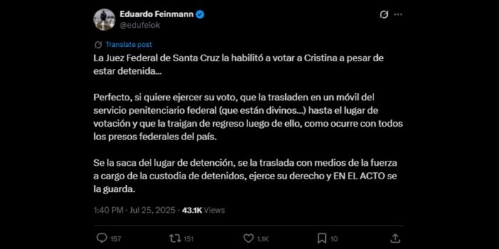 La Justicia de la provincia de Santa Cruz autorizó a ejercer el voto a Cristina Kirchner y Eduardo Feinmann se manifestó en las redes sociales al respecto de esta novedad.